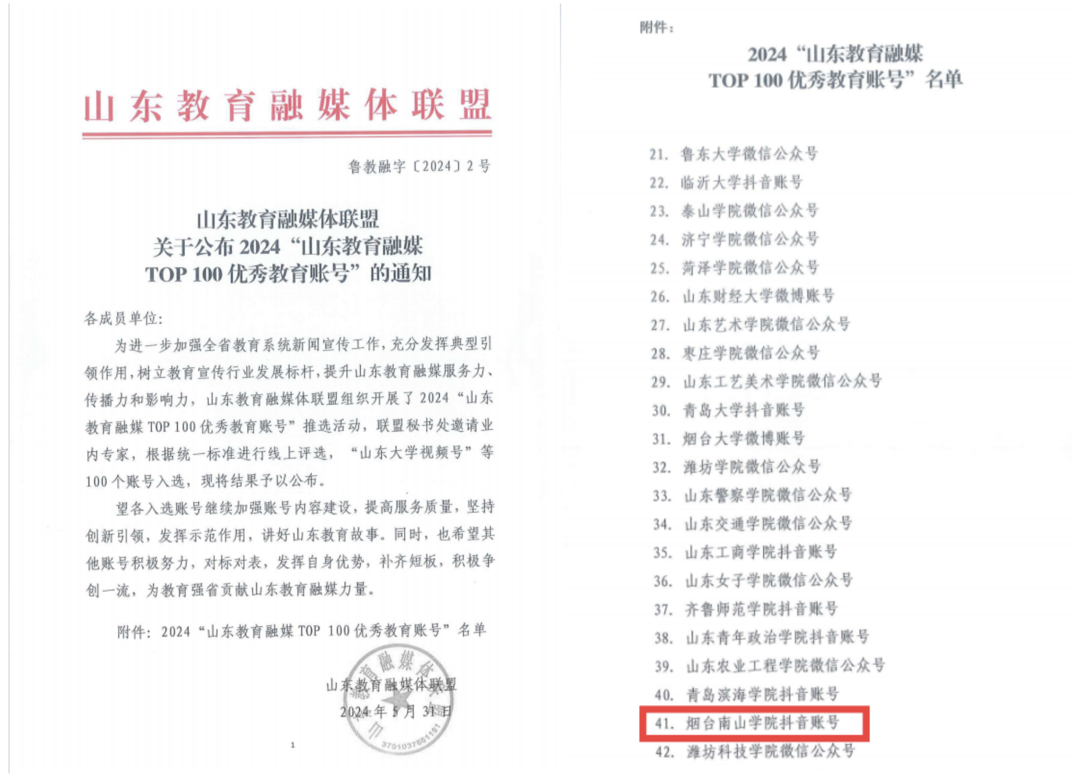 近日,山东教育融媒体联盟公布了2024“山东教育融媒TOP100优秀教育账号”名单,烟台南山学院抖音账号荣登榜单。此次入选是继烟台南山学院微信公众号入选2023“山东教育融媒TOP100优秀教育账号”后,学校官方平台又一次斩获殊荣。