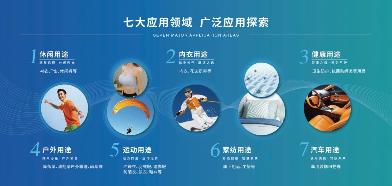 锦纶纤维性能优越,与其他纺织纤维相比,在强度和耐磨性、吸湿性等方面具有突出特点,可广泛应用于运动、休闲、内衣、家纺、健康、汽车、户外装备等领域。