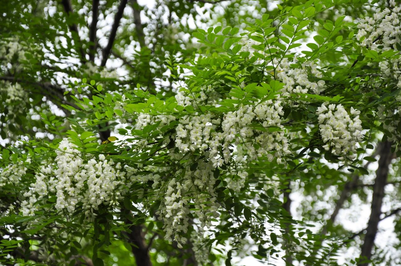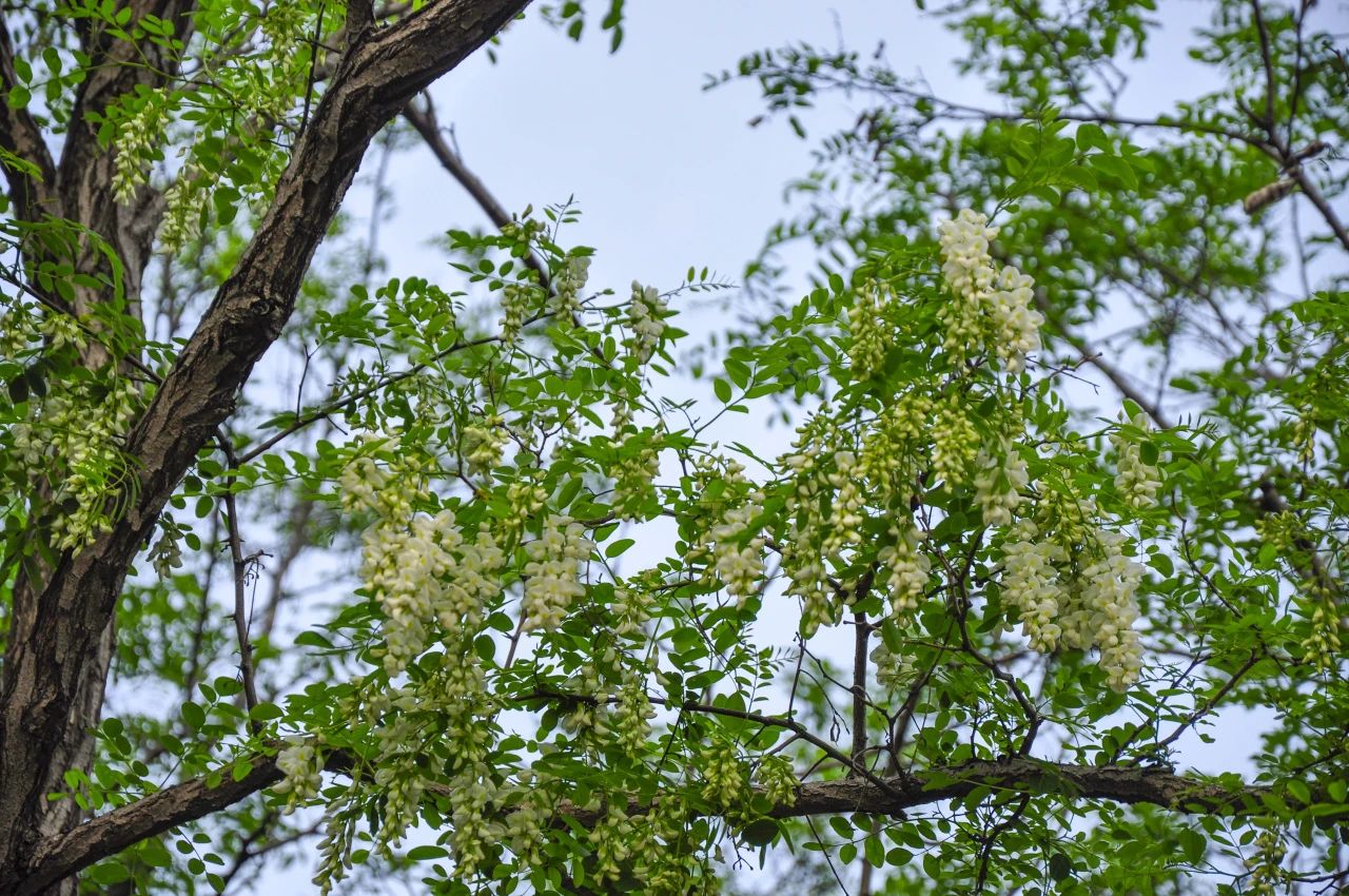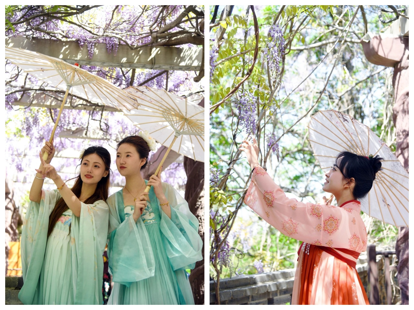 千年紫藤花廊如瀑垂落,万亩槐海,花开正盛,着汉服拍照秒变画中人。