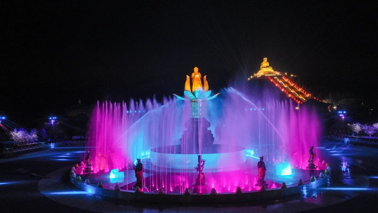 当夜幕降临,灯光水秀点亮景区,移步换景,如梦似幻,景区秒变赛博国潮宇宙!