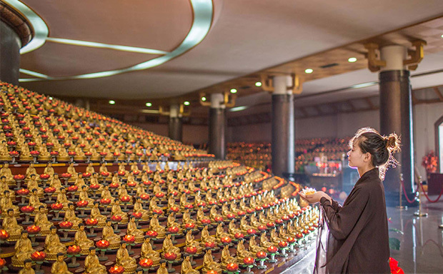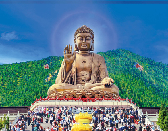 南山大佛高38.66米,重380吨,为世界第一锡青铜坐佛,护佑众生平安吉祥、诸事顺利。