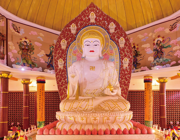 南山药师玉佛为缅甸玉雕,高13.66米,重660吨,为目前世界上最大的室内药师玉佛,护佑众生消灾延寿、福寿双增。